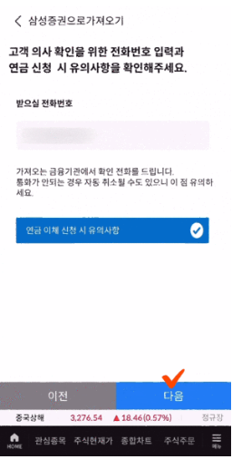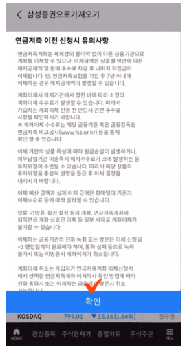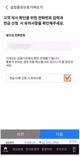 12. 연금저축 이전 여부를 확인받을 전화번호 입력 후, 유의사항을 읽고 확인 버튼 누르기