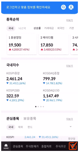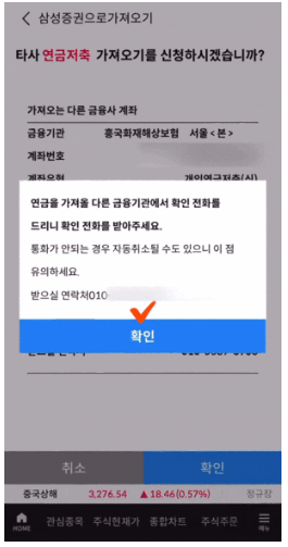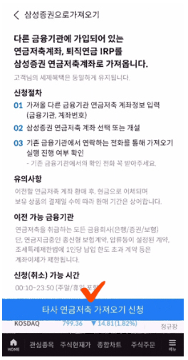 1. 삼성증권 앱을 실행하여 메인 페이지에서 타사 연금 가져오기를 클릭하기
