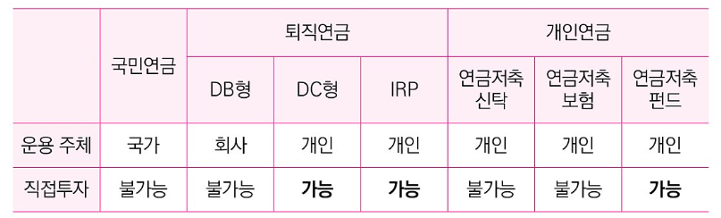 국민연금은 법정 제도로써 강제성을 가지고 있어요. 즉 소득이 있는 경우 의무적으로 국민연금에 가입해야 하지요. 운용과 지급 보증은 국가에서 하므로 개인이 관여할 부분은 없어요. 퇴직연금은 근로소득이 있는 경우 가입하는 것인데 여러 유형이 존재합니다. 그중 개인이 직접 운용할 수 있는 유형도 있어요. 마지막으로 개인연금은 주체가 개인이며, 필요에 따라 자유롭게 가입 가능합니다. 개인연급 또한 퇴직연금과 마찬가지로 본인이 직접 운용할 수 있는 유형이 있으며, 연금별 운용 주체 및 직접 투자 가능 여부는 아래의 표를 참고하세요.