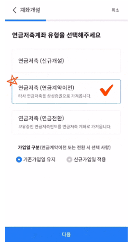 5. 연금저축계좌 유형 중, 연금 계약 이전과 기존 가입일 유지를 선택하기