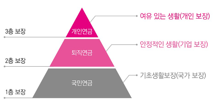 우리나라는 총 3층의 연금 보장구조를 가지고 있어요. 법정 제도인 국민연금을 통해서 기초생활을 보장하고 있고, 준법정 제도인 퇴직연금을 통해서 안정적인 노후 생활을 준비하도록 하고 있지요. 그리고 임의 제도인 개인연금을 통해 좀 더 여유로운 노후 생활을 하도록 기반을 마련해놓고 있답니다.