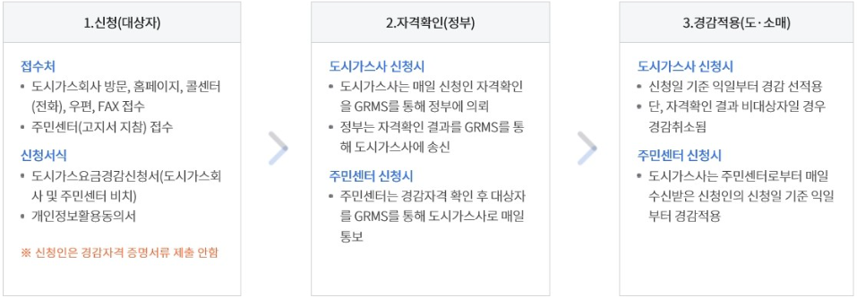- 도시가스사는 주민센터로부터  매일 수신 받은 신청인의 신청일 기준 익일부터 경감이 적용됨