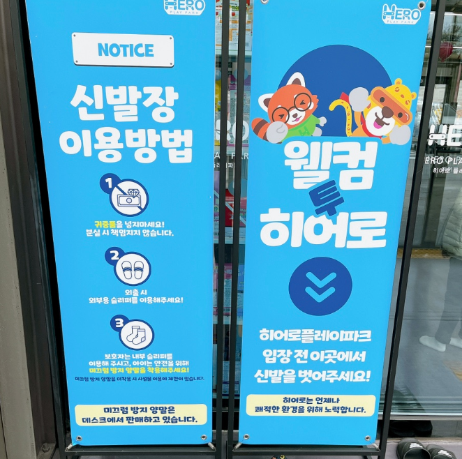 입구에 들어서면 보호자분들은 신발을 신발장에 넣으시고, 실내용 슬리퍼로 갈아 신으시면 되구요. 아이들은 미끄럼방지 양말만 착용하고 입장하면 되는데, 만약 미끄럼방지 양말이 없으시면 카운터에서 2,500원 가격으로 아이 발사이즈 맞게 구매하시면 됩니다.